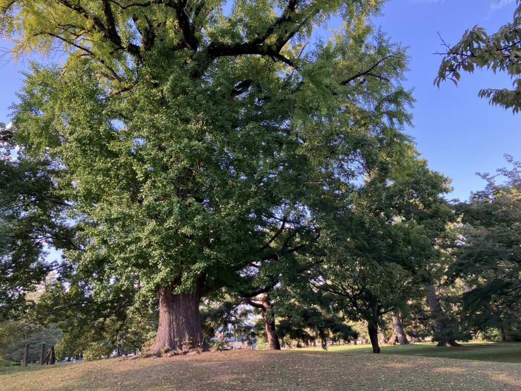 心地よいお詣りの後 広々とした砂利道を歩むと松や楠などの大木が悠々と佇んで歴史を感じます。中でも ひときわ大きなイチョウの木たそびえ立っています。樹齢何年なんでしょうね。前回訪れた時は 幼稚園児たちがイチョウの木の周りで賑やかに飛び跳ねて 木が見守っておられるかのような風景に ほのぼのとしましたよ。感謝の手を合わせると胸があたたかくなりました。